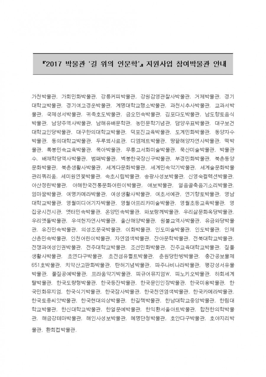 2017 박물관 길 위의 인문학 지원사업 참여박물관 페이지 정보 작성자 관리자 작성일17-03-07 09:18 조회38,893회 댓글0건 관련링크 이전글 다음글 목록 본문 2017 박물관 길 위의 인문학 지원사업 참여박물관 댓글목록 등록된 댓글이 없습니다. 이전글 다음글 목록