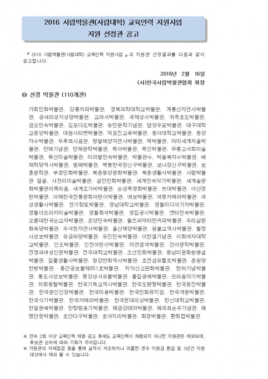 2016 사립박물관(사립대학) 교육인력 지원사업 지원 선정관 공고 페이지 정보 작성자 관리자 작성일16-02-16 19:53 조회39,701회 댓글0건 관련링크 이전글 다음글 목록 본문 댓글목록 등록된 댓글이 없습니다. 이전글 다음글 목록