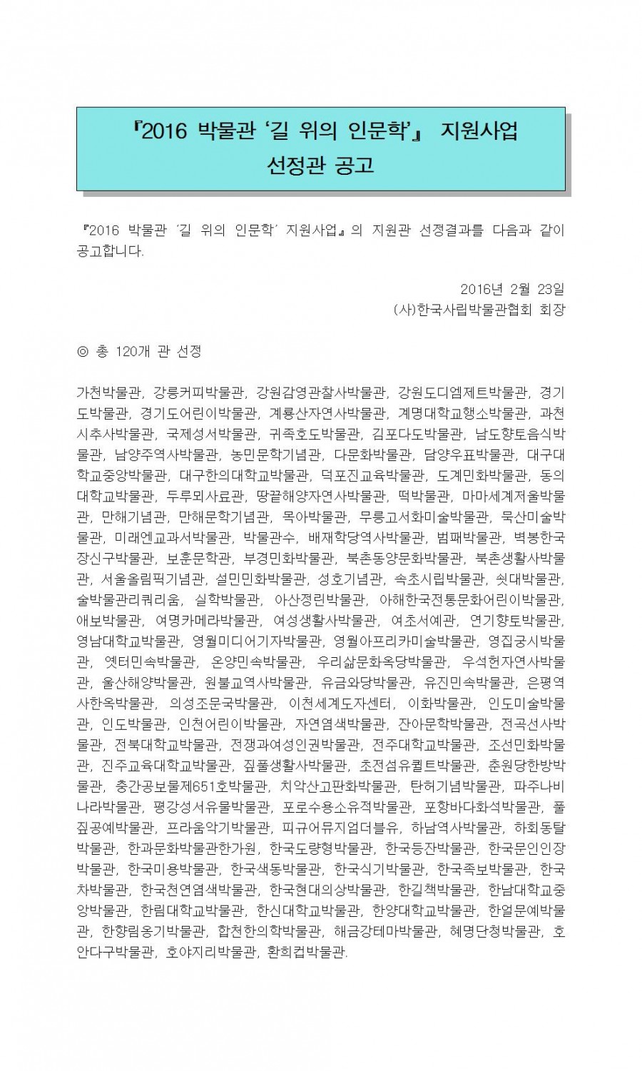 2016 박물관 '길 위의 인문학' 지원사업 선정 발표 페이지 정보 작성자 관리자 작성일16-02-23 17:04 조회39,447회 댓글0건 관련링크 이전글 다음글 목록 본문 댓글목록 등록된 댓글이 없습니다. 이전글 다음글 목록
