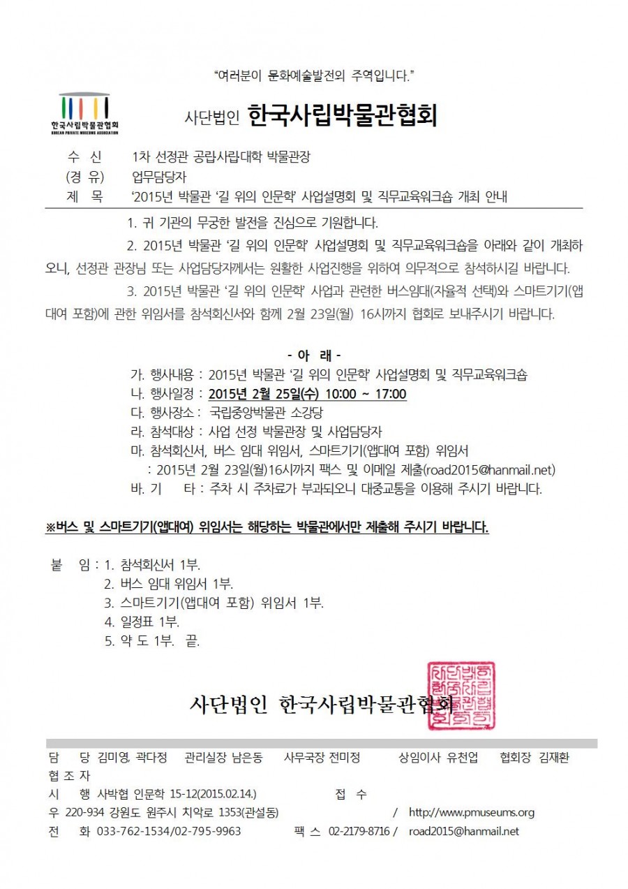 2015 박물관 ‘길 위의 인문학’ 사업설명회 및 직무교육워크숍 개최 안내 페이지 정보 작성자 관리자 작성일15-02-25 15:16 조회38,655회 댓글0건 관련링크 이전글 다음글 목록 본문 댓글목록 등록된 댓글이 없습니다. 이전글 다음글 목록