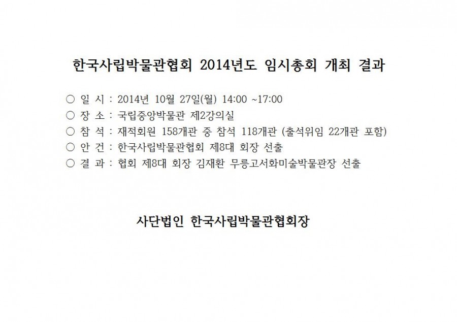 한국사립박물관협회 2014년도 임시총회 개최 결과 페이지 정보 작성자 관리자 작성일14-10-28 14:42 조회39,134회 댓글0건 관련링크 이전글 다음글 목록 본문 댓글목록 등록된 댓글이 없습니다. 이전글 다음글 목록