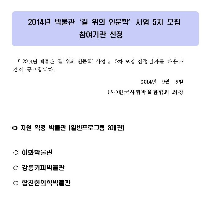 2014 박물관 길 위의 인문학 5차 기관모집 선정결과발표 페이지 정보 작성자 관리자 작성일14-09-05 14:34 조회37,464회 댓글0건 관련링크 이전글 다음글 목록 본문 댓글목록 등록된 댓글이 없습니다. 이전글 다음글 목록